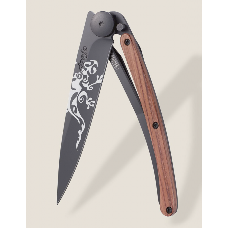 Couteau ultra léger en acier inoxydable Z40C13, finition titane noir. Lame avec cran de sécurité de type 'liner lock' décorée d'une fine gravure au laser. Clip de ceinture. Manche en Bois Corail.