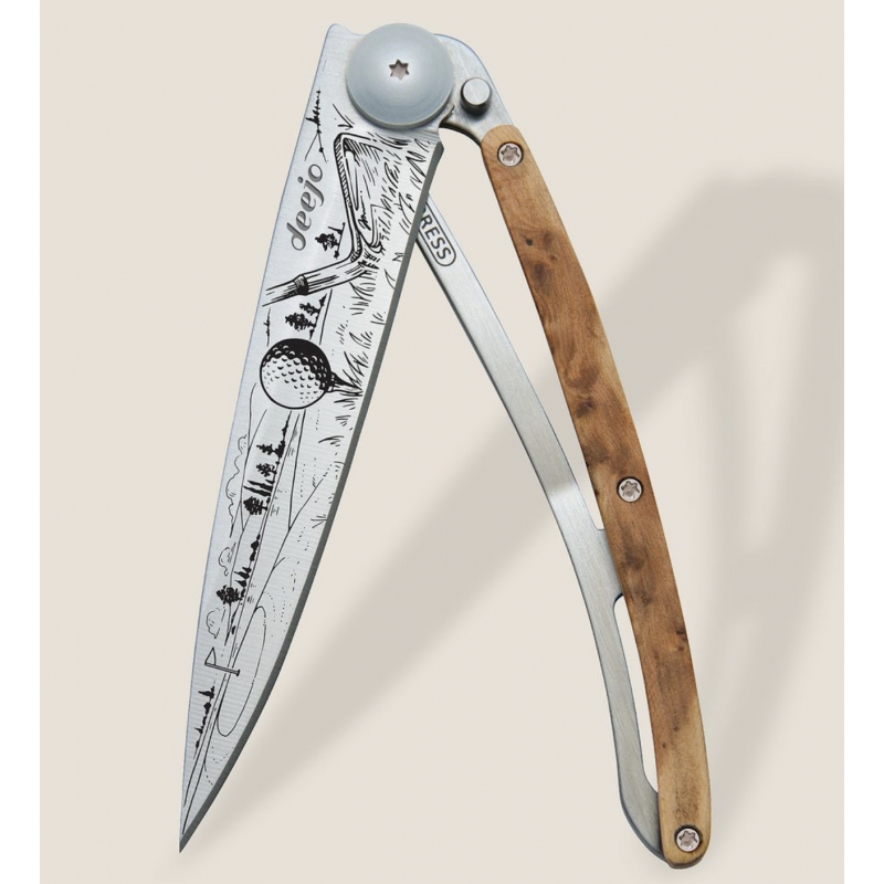 Couteau ultra léger en acier inoxydable Z40C13, finition mat. Lame avec cran de sécurité de type 'liner lock'. Clip de ceinture. Manche en Genévrier.